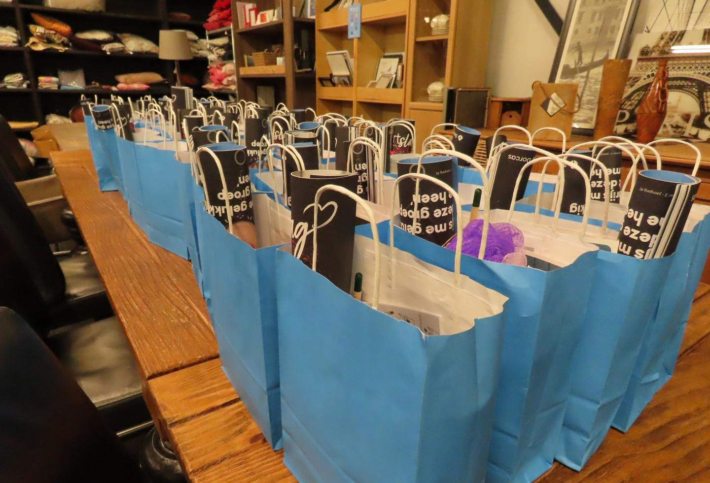 Voor de klanten waren er twee creatieve workshops: een lampionnetje haken en sieraden maken. Rond de koffietafel was het drukker dan normaal, maar dat was niet zo gek, want bij de koffie werden heerlijke zelfgemaakte lekkernijen geserveerd. Voor de Ladies Night met modeshow waren alle beschikbare vijftig plaatsen vergeven. Marja: ‘Met onze eigen vrijwilligsters erbij, waren we met zo’n 85 dames. Wat was het gezellig en wat hadden we een schik met elkaar. De gasten werden ontvangen met alcoholvrije prosecco en een lekkere bonbon. De heerlijke hapjestafel was in no time leeg, want smullen kunnen we goed in Genemuiden.