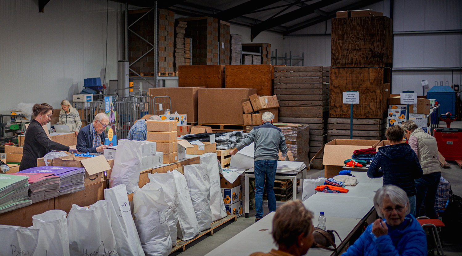 In een grote loods aan de rand van Ermelo wordt hard gewerkt voor Dorcas. Tientallen vrijwilligers zijn hier wekelijks druk bezig met het sorteren van kleding, repareren van elektrische apparaten, inpakken van materialen voor de Dorcas Voedselactie en het regelen van transporten naar Roemenië. ‘Ik ben drukker dan voor mijn pensioen. Maar dat geeft niet, het is een leuke ploeg mensen om mee te werken’, lacht vrijwilliger Hans.